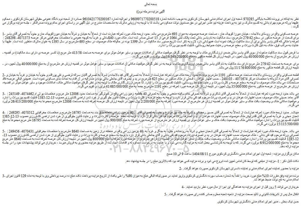نظر به اینکه در پرونده کلاسه بایگانی 970285 شعبه اول اجرای احکام مدنی شهرستان کردکوی به موجب دادنامه شماره 9609971770200518 و اجرائیه شماره 9610421770200167 صادره از شعبه دوم دادگاه عمومی حقوقی شهرستان کردکوی ، محکوم علیهما ورثه مرحوم بهرام بادلی به تقسیم ماترک و نیز به پرداخت هزینه نیم عشر اجرایی در حق صندوق دولت محکوم می باشند لذا با توجه به ارزیابی ماترک به مشخصات مندرج در ذیل آگهی در راستای اجرای حکم پرونده صدرالذکر ، جلسه مزایده برگزار می گردد :