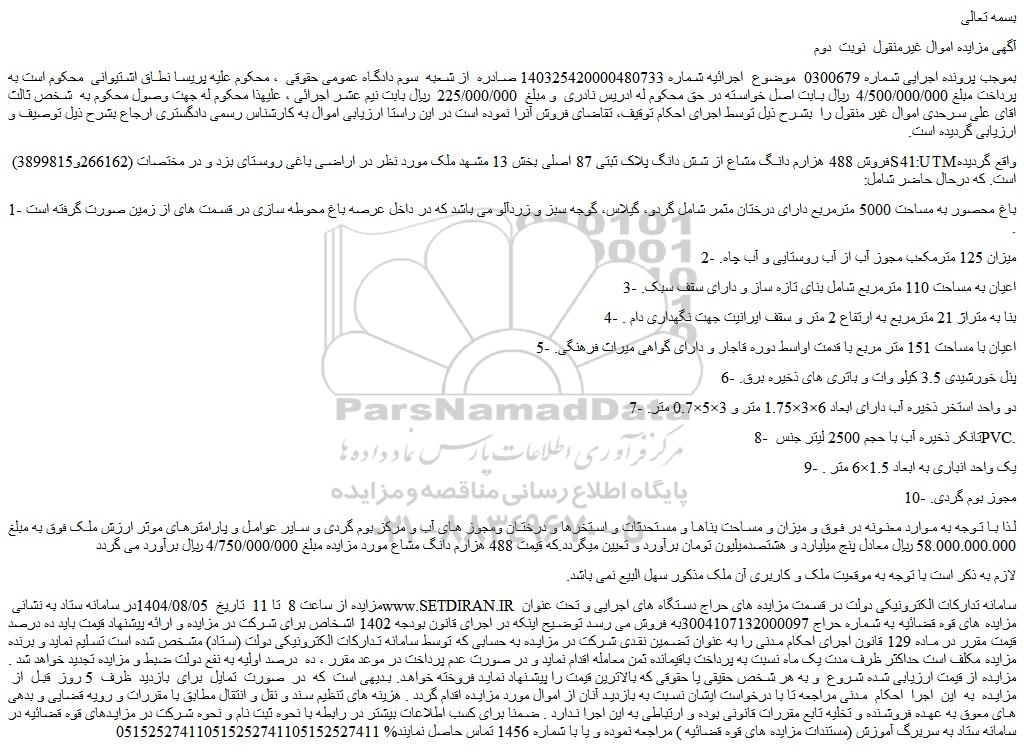 بموجب پرونده اجرایی شماره 0300679 موضوع اجرائیه شماره 140325420000480733 صادره از شعبه سوم دادگاه عمومی حقوقی ، محکوم علیه پریسا نطاق اشتیوانی محکوم است به پرداخت مبلغ 4/500/000/000 ریال بابت اصل خواسته در حق محکوم له ادریس نادری و مبلغ 225/000/000 ریال بابت نیم عشر اجرائی ، علیهذا محکوم له جهت وصول محکوم به شخص ثالث اقای علی سرحدی اموال غیر منقول را بشرح ذیل توسط اجرای احکام توقیف، تقاضای فروش آنرا نموده است در این راستا ارزیابی اموال به کارشناس رسمی دادگستری ارجاع بشرح ذیل توصیف و ارزیابی گردیده است.