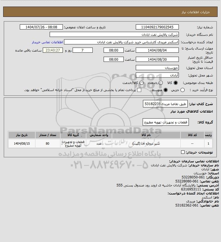 | 1 | -- | شیر دروازه ای (گیت) | عدد | قطعات و تجهیزات تهویه مطبوع | 80 | 1404/08/15 |