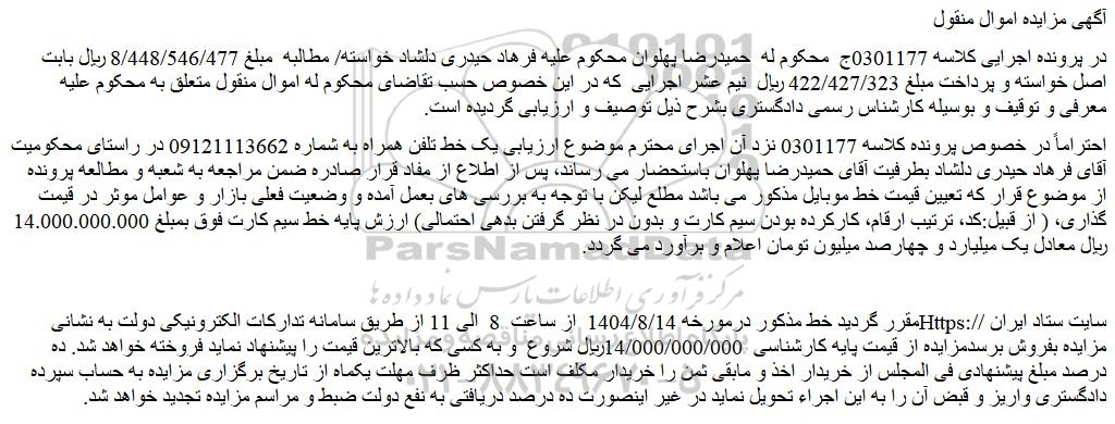 احتراماً در خصوص پرونده کلاسه 0301177 نزد آن اجرای محترم موضوع ارزیابی یک خط تلفن همراه به شماره 09121113662 در راستای محکومیت آقای فرهاد حیدری دلشاد بطرفیت آقای حمیدرضا پهلوان باستحضار می رساند، پس از اطلاع از مفاد قرار صادره ضمن مراجعه به شعبه و مطالعه پرونده از موضوع قرار که تعیین قیمت خط موبایل مذکور می باشد مطلع لیکن با توجه به بررسی های بعمل آمده و وضعیت فعلی بازار و عوامل موثر در قیمت گذاری، ( از قبیل:کد، ترتیب ارقام، کارکرده بودن سیم کارت و بدون در نظر گرفتن بدهی احتمالی) ارزش پایه خط سیم کارت فوق بمبلغ 14.000.000.000 ریال معادل یک میلیارد و چهارصد میلیون تومان اعلام و برآورد می گردد.