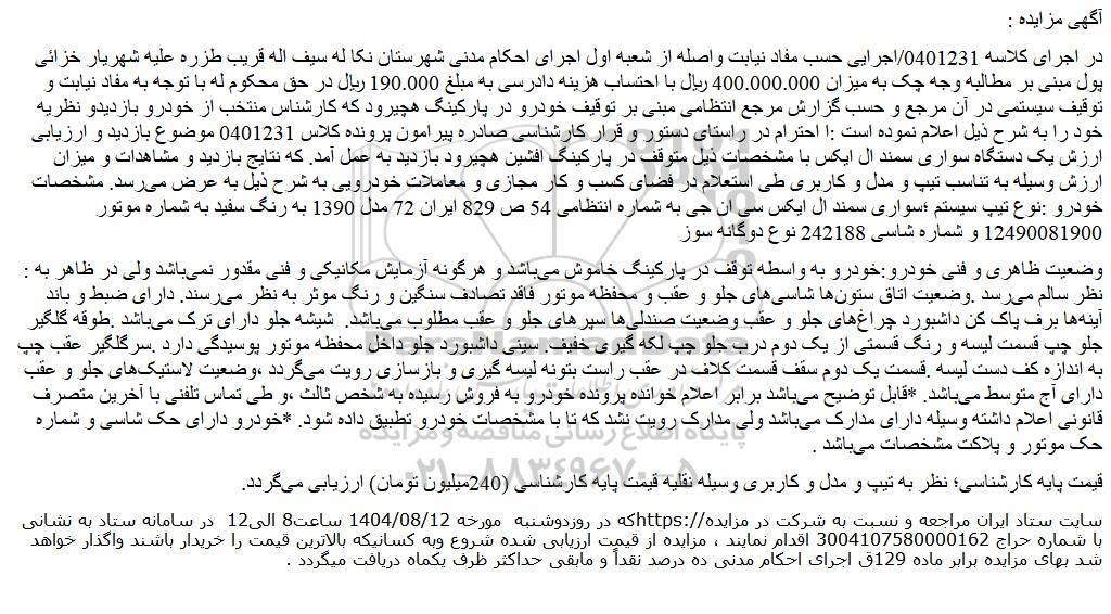 در اجرای کلاسه 0401231/اجرایی حسب مفاد نیابت واصله از شعبه اول اجرای احکام مدنی شهرستان نکا له سیف اله قریب طزره علیه شهریار خزائی پول مبنی بر مطالبه وجه چک به میزان 400.000.000 ریال با احتساب هزینه دادرسی به مبلغ 190.000 ریال در حق محکوم له با توجه به مفاد نیابت و توقیف سیستمی در آن مرجع و حسب گزارش مرجع انتظامی مبنی بر توقیف خودرو در پارکینگ هچیرود که کارشناس منتخب از خودرو بازدیدو نظریه خود را به شرح ذیل اعلام نموده است :ا احترام در راستای دستور و قرار کارشناسی صادره پیرامون پرونده کلاس 0401231 موضوع بازدید و ارزیابی ارزش یک دستگاه سواری سمند ال ایکس با مشخصات ذیل متوقف در پارکینگ افشین هچیرود بازدید به عمل آمد. که نتایج بازدید و مشاهدات و میزان ارزش وسیله به تناسب تیپ و مدل و کاربری طی استعلام در فضای کسب و کار مجازی و معاملات خودرویی به شرح ذیل به عرض می رسد. مشخصات خودرو :نوع تیپ سیستم ؛سواری سمند ال ایکس سی ان جی به شماره انتظامی 54 ص 829 ایران 72 مدل 1390 به رنگ سفید به شماره موتور 12490081900 و شماره شاسی 242188 نوع دوگانه سوز