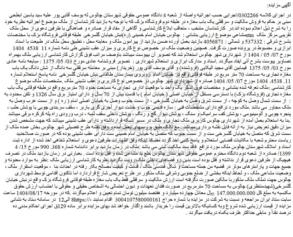 در اجرای کلاسه 0302266/اجرایی حسب اجرائیه واصله از شعبه 4 دادگاه عمومی حقوقی شهرستان چالوس له یوسف آقایی پور علیه سید یاسین ابطحی مبنی بر حکم به فروش مالکیت و سرقفلی یک باب مغازه در طبقه دوم فروشگاه بزک که با توجه به بازدید کارشناسان از ملک موضوع اجرائیه نظریه خود را به شرح ذیل اعلام نموده اند:در کارشناسان منتخب ، متعاقب ابلاغ کارشناسی و آگاهی از مفاد قرار صادره و هماهنگی با طرفین دعوی از محل ملک مشاعی موضوع ارزیابی بنشانی : چالوس خیابان امام خمینی (ره)نبش خیابان گلسرخی طبقه فوقانی فروشگاه بزک با مختـصات utm تقریبی مرکز ملک بشـرح شرقی : 537332 و شمالی : 4056871 بازدید بعمل آورده ضمن بازدید از پیرامون ملک و معاینه محل ، تطبیق محل ملک در طبیعت با اسناد ابرازی و مضبوط در پرونده صورت گرفت. همچنین وضعیت ملک در خصوص نوع کاربری و میزان عقب نشینی طی نامه شماره 11 4538 1404 مورخ 07/ 05 / 1404 از شهرداری شهر چالوس استعلام شد که تصویر آن بپیوست میباشد باوصف مراتب فوق گزارش کارشناسی ارزیابی ملک بهمراه تصاویر پیوست بشرح آتی ایفاد میگردد .اسناد و مدارک ابرازی و استعلام شهرداری : تصویر فروشنامه عادی مورخ 03/ 05/ 1375 : مبایعه نامه عادی مورخ 03/ 05/ 1375 فیمابین آقای مجید الیکایی (فروشنده) و آقای یوسف آقای پور (خریدار) مبنی بر معامله سرقفلی سه دانگ از شش دانگ یک باب مغازه تجاری به مساحت 70 متر مربع در طبقه فوقانی واقع در خیابان امام روبروی بیمارستان طالقانی نبش خیابان گلسرخی نامه پاسخ استعلام شماره 11. 4538. 1404 مورخ 07/ 05/ 1404 صادره از شهرداری شهر چالوس در خصوص نوع کاربری و عقب نشینی ملک .مشخصات ملک موضوع کارشناسی :ملک تعرفه شده بنشانی و مختصات فوق الذکر یک واحد با موقعیت اداری تجاری به مساحت حدود 70 مترمربع واقع درطبقه فوقانی یک باب مغازه تجاری (فروشگاه بزک) با دسترسی مستقل از خیابان اصلی ( خیابان امام ) با قدمت بیش از 70 سال و دارای امتیاز برق سال 1326 و تلفن محدود به : از سمت شمال وصل به کوچه ، از سمت شرق وصل به خیابان گلسرخی ، از سمت جنوب وصل به خیابان اصلی امام ( ره ) و از سمت غرب وصل به ملک مجاور می باشد .ملک مورد ترافع دارای مشخصات فنی : سازه قدیمی چوب و خشت دیوار آجری گری باربر ، سقف سربندی چوبی با پوشش حلب ، پنجره چوبی و آلومینیومی ، پوشش کف سرامیک و سنگ ، پوشش دیوار گچ و رنگ ، پوشش داخلی سقف لمبه ، درب ورودی راه پله کرکره برقی میباشد .بنا به استعلام بعمل آمده از شهرداری چالوس کاربری ملک تجاری و ملک در مسیر شبکه قرارداشته و دارای عقب نشینی میباشد که جهت مشخص شدن میزان دقیق تعریض نیاز به ارائه فایل نقشه برداری میباشد . مع ذالک طبق بررسیهای بعمل آمده و وفق نقشه طرح تفضیلی شهر چالوس بخش عمده ملک از سمت شرق که متصل به خیابان گلسرخی ست و از سمت جنوب که متصل به خیابان امام خمینی ست دارای عقب نشینی بوده که در صورت صلاحدید ریاست محترم شعبه با مکاتبات قضایی استعلام و پاسخ کتبی اخذ گردد مضافا اینکه وفق اظهارات طرفین دعوی و استعلام شفاهی اخذ شده از اداره ثبت اسناد و املاک شهرستان چالوس ملک مورد ترافع فاقد سند مالکیت ثبتی می باشد .ملک در زمان بازدید برابر دادنامه شماره 368. 990 مورخ 15/ 4 /1399 صادره از شعبه دوم دادگاه محترم عمومی حقوقی شهرستان چالوس خلع ید مشاعی شده و قفل بوده است . بعبارتی در زمان بازدید ملک در تصرف هیچیک از طرفین دعوی قرار نداشته و قفل بوده است بدین رو فضاهای داخلی ملک رویت نگردید.نظریه کارشناسی ارزیابی ملک :نظر به موارد معنونه و جمیع جهات و پارامترهای موثر در قضیه من جمله مساحت و شکل هندسی ملک ، قدمت و کیفیت مصالح بکار رفته در احداث بنا ، موقعیت استقرار ملک ، وضعیت مشاعی ملک ، و لحاظ اینکه بخشی از ضلع جنوبی وشرقی ملک مذکور در طرح تعریض شارع قراردارد اما تاکنون اقدامی توسط شهرداری چالوس جهت تملک ملک مذکوربا مالکین صورت نگرفته است ارزش مالکیت و سرقفلی فقط یک باب مغازه طبقه فوقانی فروشگاه بزک واقع درنبش خیابان گلسرخی(شهیدمنتظری) چالوس به مساحت 70 مترم