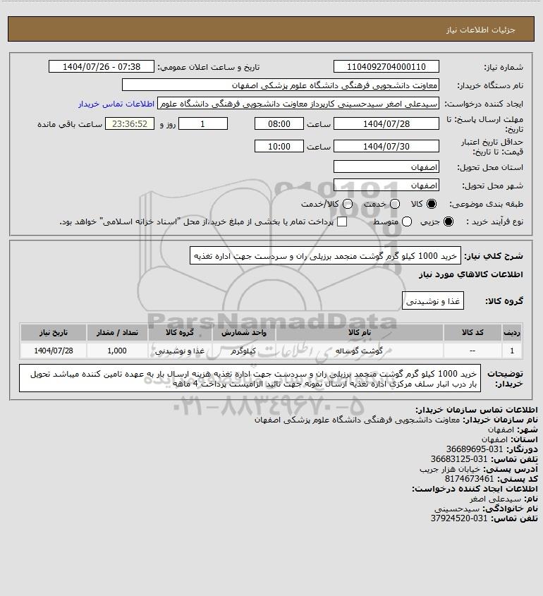 شرح کلی نیاز: خرید 1000 کیلو گرم گوشت منجمد برزیلی ران و سردست جهت اداره تغذیه