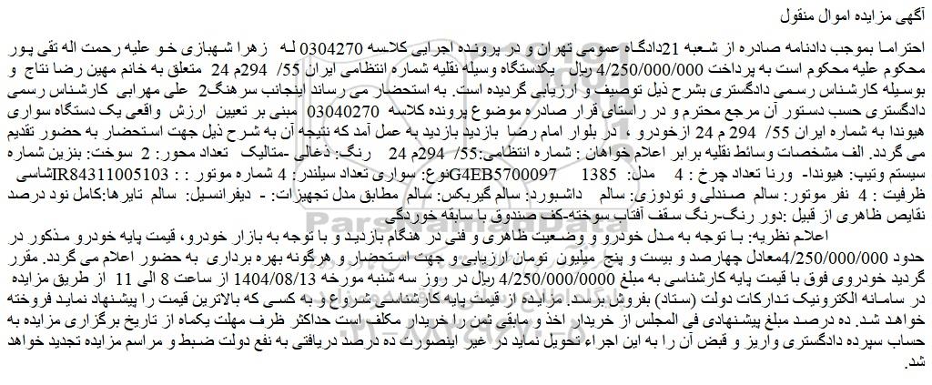 احتراما بموجب دادنامه صادره از شعبه 21دادگاه عمومی تهران و در پرونده اجرایی کلاسه 0304270 له زهرا شهبازی خو علیه رحمت اله تقی پور محکوم علیه محکوم است به پرداخت 4/250/000/000 ریال یکدستگاه وسیله نقلیه شماره انتظامی ایران 55/ 294م 24 متعلق به خانم مهین رضا نتاج و بوسیله کارشناس رسمی دادگستری بشرح ذیل توصیف و ارزیابی گردیده است. به استحضار می رساند اینجانب سرهنگ2 علی مهرابی کارشناس رسمی دادگستری حسب دستور آن مرجع محترم و در راستای قرار صادره موضوع پرونده کلاسه 03040270 مبنی بر تعیین ارزش واقعی یک دستگاه سواری هیوندا به شماره ایران 55/ 294 م 24 ازخودرو ، در بلوار امام رضا بازدید بازدید به عمل آمد که نتیجه آن به شرح ذیل جهت استحضار به حضور تقدیم می گردد. الف مشخصات وسائط نقلیه برابر اعلام خواهان : شماره انتظامی:55/ 294م 24 رنگ: ذغالی -متالیک تعداد محور: 2 سوخت: بنزین شماره شاسی ir84311005103 :نوع: سواری تعداد سیلندر: 4 شماره موتور : g4eb5700097 سیستم وتیپ: هیوندا- ورنا تعداد چرخ : 4 مدل: 1385 ظرفیت : 4 نفر موتور: سالم صندلی و تودوزی: سالم داشبورد: سالم گیربکس: سالم مطابق مدل تجهیزات: - دیفرانسیل: سالم تایرها:کامل نود درصد نقایص ظاهری از قبیل :دور رنگ-رنگ سقف آفتاب سوخته-کف صندوق با سابقه خوردگی اعلام نظریه: با توجه به مدل خودرو و وضعیت ظاهری و فنی در هنگام بازدید و با توجه به بازار خودرو، قیمت پایه خودرو مذکور در حدود 4/250/000/000معادل چهارصد و بیست و پنج میلیون تومان ارزیابی و جهت استحضار و هرگونه بهره برداری به حضور اعلام می گردد. مقرر گردید خودروی فوق با قیمت پایه کارشناسی به مبلغ 4/250/000/0000 ریال در روز سه شنبه مورخه 1404/08/13 از ساعت 8 الی 11 از طریق مزایده در سامانه الکترونیک تدارکات دولت (ستاد) بفروش برسد. مزایده از قیمت پایه کارشناسی شروع و به کسی که بالاترین قیمت را پیشنهاد نماید فروخته خواهد شد. ده درصد مبلغ پیشنهادی فی المجلس از خریدار اخذ و مابقی ثمن را خریدار مکلف است حداکثر ظرف مهلت یکماه از تاریخ برگزاری مزایده به حساب سپرده دادگستری واریز و قبض آن را به این اجراء تحویل نماید در غیر اینصورت ده درصد دریافتی به نفع دولت ضبط و مراسم مزایده تجدید خواهد شد.