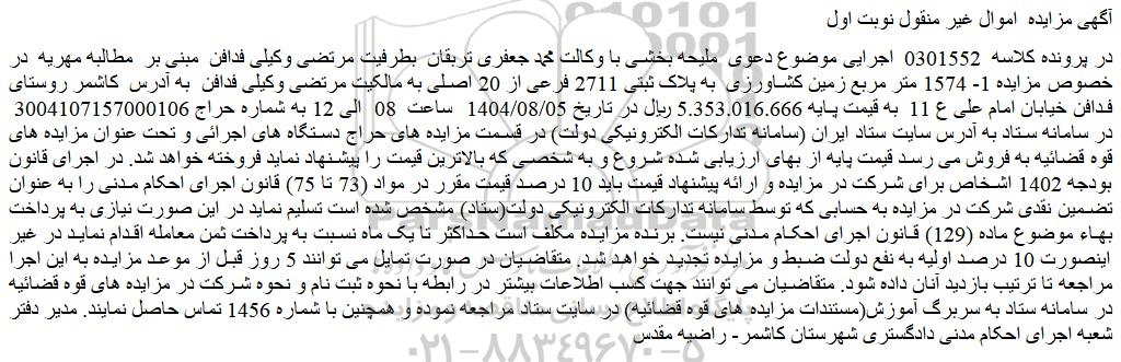در پرونده کلاسه 0301552 اجرایی موضوع دعوی ملیحه بخشی با وکالت محمد جعفری تربقان بطرفیت مرتضی وکیلی فدافن مبنی بر مطالبه مهریه در خصوص مزایده 1- 1574 متر مربع زمین کشاورزی به پلاک ثبتی 2711 فرعی از 20 اصلی به مالکیت مرتضی وکیلی فدافن به آدرس کاشمر روستای فدافن خیابان امام علی ع 11 به قیمت پایه 5.353.016.666 ریال در تاریخ 1404/08/05 ساعت 08 الی 12 به شماره حراج 3004107157000106 در سامانه ستاد به آدرس سایت ستاد ایران (سامانه تدارکات الکترونیکی دولت) در قسمت مزایده های حراج دستگاه های اجرائی و تحت عنوان مزایده های قوه قضائیه به فروش می رسد قیمت پایه از بهای ارزیابی شده شروع و به شخصی که بالاترین قیمت را پیشنهاد نماید فروخته خواهد شد. در اجرای قانون بودجه 1402 اشخاص برای شرکت در مزایده و ارائه پیشنهاد قیمت باید 10 درصد قیمت مقرر در مواد (73 تا 75) قانون اجرای احکام مدنی را به عنوان تضمین نقدی شرکت در مزایده به حسابی که توسط سامانه تدارکات الکترونیکی دولت(ستاد) مشخص شده است تسلیم نماید در این صورت نیازی به پرداخت بهاء موضوع ماده (129) قانون اجرای احکام مدنی نیست. برنده مزایده مکلف است حداکثر تا یک ماه نسبت به پرداخت ثمن معامله اقدام نماید در غیر اینصورت 10 درصد اولیه به نفع دولت ضبط و مزایده تجدید خواهد شد. متقاضیان در صورت تمایل می توانند 5 روز قبل از موعد مزایده به این اجرا مراجعه تا ترتیب بازدید آنان داده شود. متقاضیان می توانند جهت کسب اطلاعات بیشتر در رابطه با نحوه ثبت نام و نحوه شرکت در مزایده های قوه قضائیه در سامانه ستاد به سربرگ آموزش(مستندات مزایده های قوه قضائیه) در سایت ستاد مراجعه نموده و همچنین با شماره 1456 تماس حاصل نمایند. مدیر دفتر شعبه اجرای احکام مدنی دادگستری شهرستان کاشمر- راضیه مقدس