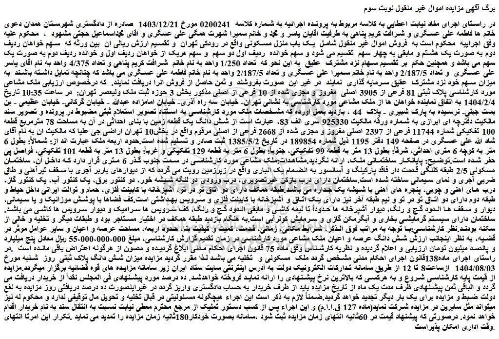 در راستای اجرای مفاد نیابت اعطایی به کلاسه مربوط به پرونده اجرائیه به شماره کلاسه 0200241 مورخ 1403/12/21 صادره از دادگستری شهرستان همدان دعوی خانم ها فاطمه علی عسگری و شرافت کریم پناهی به طرفیت آقایان یاسر و محمد و خانم سمیرا شهرت همگی علی عسگری و آقای محمداسماعیل حجتی مشهود ، محکوم علیه وفق اجراییه محکوم است به فروش اموال غیر منقول شامل یک باب منزل مسکونی واقع در رودکی تهران و تقسیم ارزش ریالی ان بین ورثه که سهم خواهان ردیف دوم به صورت یک هشتم و مابقی به چهار سهم تقسیم می شود و سهم خوانده ردیف اول دو سهم و سهم هریک از خواهان ردیف اول و خوانده ردیف دوم به صورت یک سهم می باشد و همچنین حکم بر تقسیم سهام نزد مشترک عقیق به این نحو که تعداد 1/250 واحد به نام خانم شرافت کریم پناهی و تعداد 4/375 واحد به نام اقای یاسر علی عسگری و تعداد 2/187/5 واحد به نام خانم سمیرا علی عسگری و تعداد 2/187/5 واحد به نام خانم فاطمه علی عسگری می باشد که چنانچه تمایل داشته باشند به میزان سهم خود نزد مشترک عقیق سرمایه گذاری نمایند در غیر این صورت بفروشند و ثمن حاصل از فروش انرا دریافت نمایند. که درخصوص ارزیابی ملک مشاعی مورد کارشناسی پلاک ثبتی 81 فرعی از 3905 اصلی مفروز و مجزی شده از 10 فرعی از اصلی مذکور بخش 3 حوزه ثبت ملک ولیعصر تهران: در ساعت 10:35 تاریخ 1404/2/4 به اتفاق نماینده خواهان ها از ملک مشاعی مورد کارشناسی به نشانی تهران- خیابان سه راه آذری- خیابان امامزاده عبدالله - خیابان گرکانی- خیابان عظیمی - بن بست جبلی- نرسیده به پارک شبیری - پلاک 44 ، بازدید بعمل آورده که مشخصات ملک مورد کارشناسی به استناد تصویر استعلام ثبتی مضبوط در پرونده و تصویر سند مالکیت دفترچه ای ابرازی به شماره ورقه مالکیت 925330 سری الف 83، عبارت است از شش دانگ یک قطعه زمین با بنای احداثی در آن به مساحت 78 مترمربع قطعه 100 تفکیکی شماره 11744 فرعی از 2397 اصلی مفروز و مجزی شده از 2668 فرعی از اصلی مرقوم واقع در بخش10 تهران اراضی جی علیا که مالکیت ان به نام آقای شاد الله علی عسگری در صفحه 149 دفتر 1195 ذیل شماره 189854 در تاریخ 1385/5/2 ثبت صادر و تسلیم شده است.حدود اربعه ملک عبارت اند از: شمالاً: بطول 6 متر به کوچه 6 متری احداثی، شرقاً: بطول 13 متر به قطعه 99 تفکیکی، جنوباً: بطول 6 متر به قطعه 129 تفکیکی و غرباً: بطول 13 متر به قطعه 101 تفکیکی، فواصل پی حفر شده است.توضیح: پایانکار ساختمانی ملک، ارائه نگردید.مشاهدات:ملک مشاعی مورد کارشناسی در سمت جنوب گذر 6 متری قرار دارد که داخل آن، ساختمان مسکونی 2/5 طبقه کلنگی قدمت دار فاقد پارکینگ و آسانسور به انضمام یک انباری واقع در زیرزمین رویت می گردد که از دیوارهای باربر آجری با سقف تیرآهنی و طاق ضربی آجری و نمای سیمانی ساخته شده است.ساختمان دارای درب بازکن غیرتصویری، درب ورودی دو لنگه شیشه خور، دو کنتور برق، یک کنتور آب، یک کنتور گاز، درب های آهنی و چوبی، پنجره های آهنی با شیشه یک جداره می باشد.طبقه همکف دارای دو اتاق تو در تو، آشپزخانه با کابینت فلزی، حمام و توالت ایرانی داخل حیاط و طبقه دوم دارای دو اتاق تو در تو و نیم طبقه آخر نیز دارای یک اتاق و آشپزخانه با کابینت فلزی و سرویس بهداشتی است.کف فضاها با پوشش موزائیک و یا سیمانی، دیوار و سقف ها اندود گچ و رنگ، دیوار آشپرخانه ها حدوداً تا نیمه کاشی و مابقی اندود گچ و رنگ، کف سرویس ها سرامیک و دیوار سرویس ها کاشی می باشد. ساختمان دارای سیستم گرمایشی بخاری و آبگرمکن گازی و سرمایش کولرآبی است.به هنگام بازدید طبقه همکف در اختیار مستاجر بود و طبقات دیگر و تخلیه و خالی از سکنه بودند.نظر کارشناسی:با توجه به مراتب فوق الذکر، شرایط مکانی، زمانی، قدمت، کمیت و کیفیت بنا، حدود اربعه، مساحت عرصه و اعیان و سایر عوامل موثر در قضیه، به نظر اینجانب ارزش شش دانگ عرصه و اعیان ملک مشاعی مورد کارشناسی در زمان تقدیم گزارش کارشناسی، مبلغ 55،000،000،000 ریال معادل پنج میلیارد و پانصد میلیون تومان ارزیابی و اعلام گردیده و نظریه کارشناس وفق ماده 75 قان