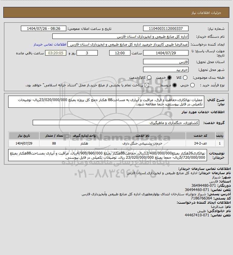 شرح کلی نیاز: عملیات نهالکاری،حفاظت و قرق، مراقبت و آبیاری به مساحت88 هکتار جمع کل پروژه بمبلغ 23/020/000/000ریال- توضیحات تکمیلی در فایل پیوستی- حتما مطالعه شود.