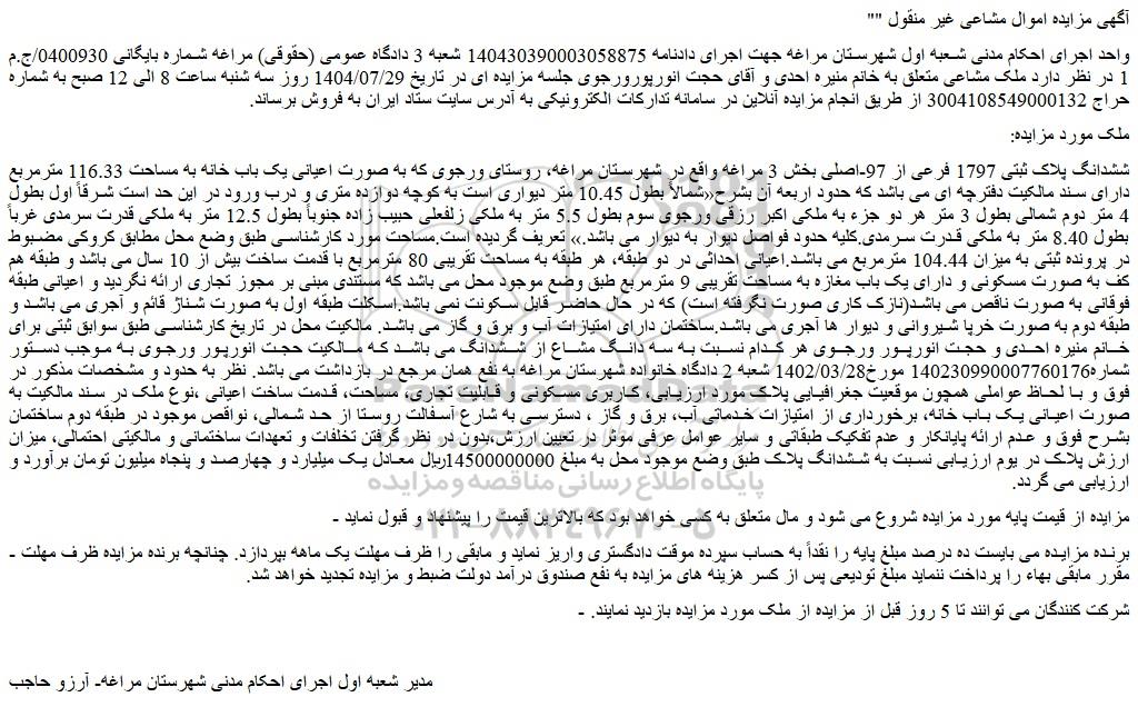 واحد اجرای احکام مدنی شعبه اول شهرستان مراغه جهت اجرای دادنامه 140430390003058875 شعبه 3 دادگاه عمومی (حقوقی) مراغه شماره بایگانی 0400930/ج.م 1 در نظر دارد ملک مشاعی متعلق به خانم منیره احدی و آقای حجت انورپورورجوی جلسه مزایده ای در تاریخ 1404/07/29 روز سه شنبه ساعت 8 الی 12 صبح به شماره حراج 3004108549000132 از طریق انجام مزایده آنلاین در سامانه تدارکات الکترونیکی به آدرس سایت ستاد ایران به فروش برساند.