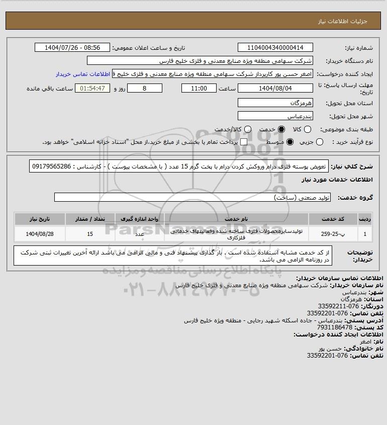 شرح کلی نیاز: تعویض پوسته فلزی درام وروکش کردن درام با پخت گرم 15 عدد ( با مشخصات پیوست ) - کارشناس : 09179565286