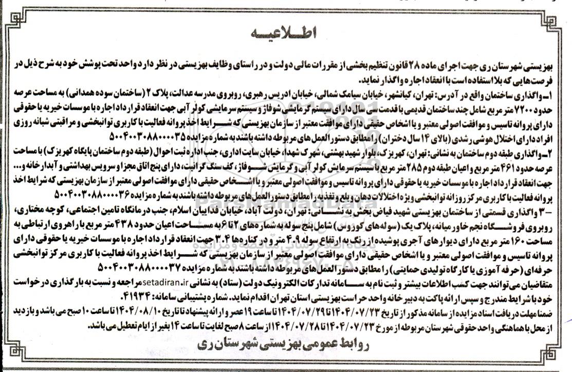 بهزیستی شهرستان ری جهت اجرای ماده 28 قانون تنظیم بخشی از مقررات مالی دولت و در راستای وظایف بهزیستی در نظر دارد واحد تحت پوشش خود به شرح ذیل در فرصت هایی که بلا استفاده است با انعقاد اجاره واگذار نماید.