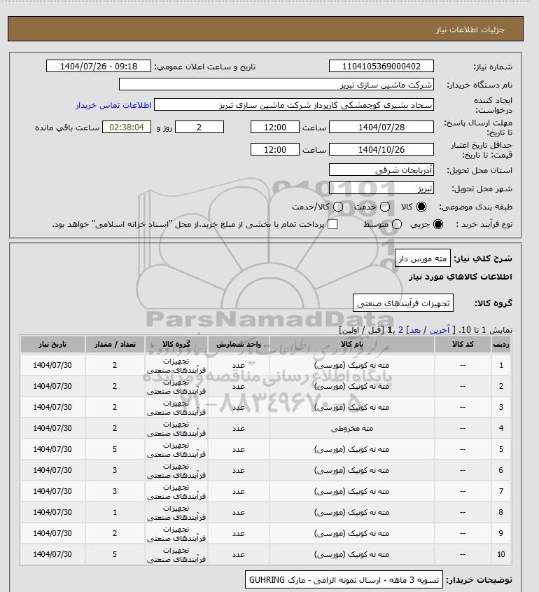 | 3 | -- | مته ته کونیک (مورسی) | عدد | تجهیزات فرآیندهای صنعتی | 2 | 1404/07/30 |