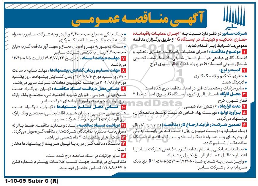 شرکت سابیر در نظر دارد نسبت به "اجرای عملیات باقیمانده حفاری، تحکیم و لاینینگ در ایستگاه G " از طریق برگزاری مناقصه عمومی با شرایط زیر اقدام نماید: