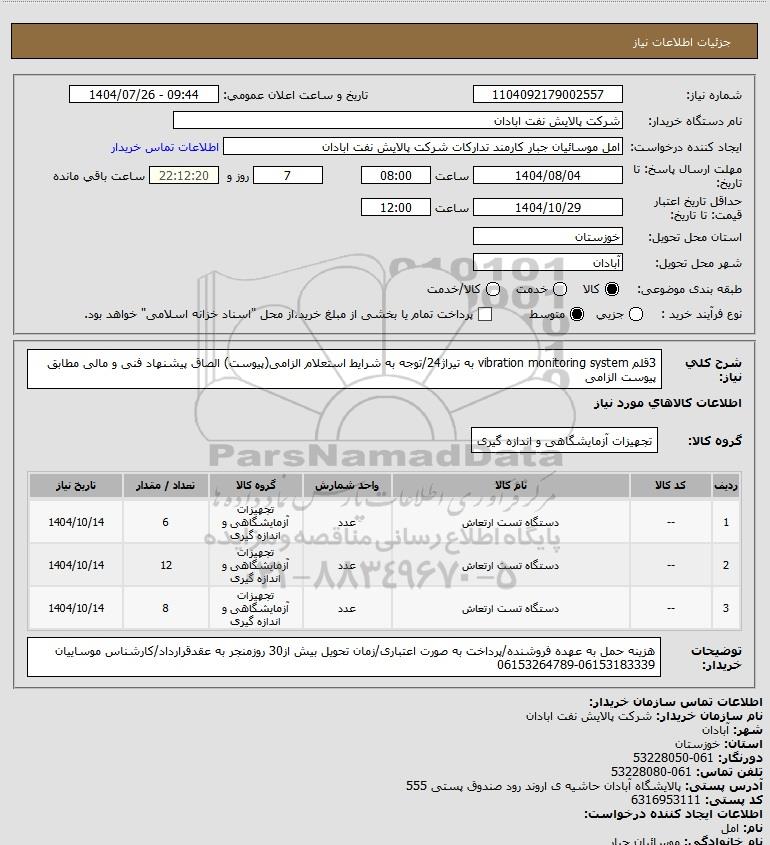 استعلام بها و موضوع استعلام استعلام 3قلم vibration monitoring system به تیراژ24/توجه به شرایط استعلام الزامی(پیوست) الصاق پیشنهاد فنی و مالی مطابق پیوست الزامی به اطلاع کلیه شرکتها و افراد متخصص واجد شرایط میرساند، آگهی گذار در نظر دارد از طریق استعلام بها، نسبت به انتخاب و دریافت پیشنهادات اقدام نماید. این استعلام با کد آگهی ثبت شده در سامانه خبرگزاری پارس نماد : 9711907 منتشر شده است. مشخصات استعلام : تاریخ شروع استعلام: 1404/07/26 آخرین مهلت ارسال پیشنهاد قیمت : 1404/08/04 و محل اجرای پروژه : استان خوزستان میباشد. استعلام قیمت مورد درخواست : استعلام 3قلم vibration monitoring system به تیراژ24/توجه به شرایط استعلام الزامی(پیوست) الصاق پیشنهاد فنی و مالی مطابق پیوست الزامی با دستهبندیهای تخصصی و گروه های مرتبط : ابزار دقیق, تجهیزات نفت و گاز, استعلام اطلاع رسانی میگردد.