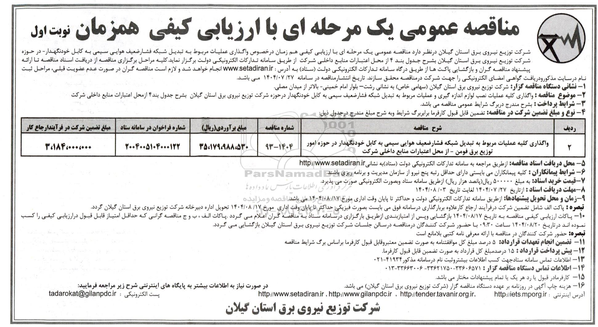 شرکت توزیع نیروی برق استان گیلان در نظر دارد مناقصه عمومی یک مرحله ای با ارزیابی کیفی هم زمان در خصوص واگذاری عملیات مربوط به تبدیل شبکه فشار ضعیف هوایی سیمی به کابل خودنگهدار - در حوزه شرکت توزیع نیروی برق استان گیلان بشرح جدول بند 4 از محل اعتبارات منابع داخلی شرکت از طریق سامانه تدارکات الکترونیکی دولت برگزار نماید. کلیه مراحل برگزاری مناقصه از دریافت اسناد مناقصه تا ارائه پیشنهاد مناقصه گران و بازگشایی پاکت ها از طریق درگاه سامانه تدارکات الکترونیکی دولت (ستاد) به آدرس :ستاد ایران انجام خواهد شد و لازم است مناقصه گران در صورت عدم عضویت قبلی، مراحل ثبت نام در سایت مذکور و دریافت گواهی امضای الکترونیکی را جهت شرکت در مناقصه محقق سازند تاریخ انتشار مناقصه در سامانه 1404.07.27 می باشد.