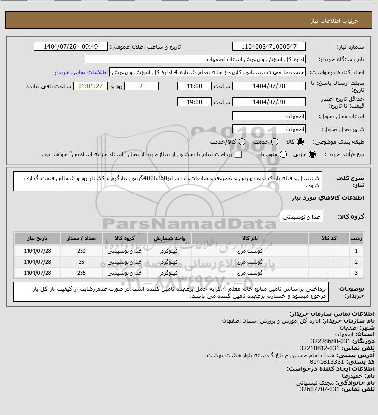 شرح کلی نیاز: شنیسل و فیله باریک بدون چربی و غضروف و ضایعات.ران سایز350تا400گرمی .بارگرم و کشتار روز و شمالی قیمت گذاری شود.