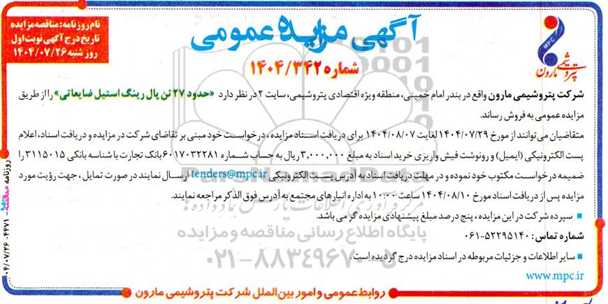 شرکت پتروشیمی مارون واقع در بندر امام خمینی – منطقه ویژه اقتصادی پتروشیمی – سایت 2 در نظر دارد  “ حدود 27 تن پال رینگ استیل ضایعاتی " را از طریق مزایده عمومی بفروش رساند.
