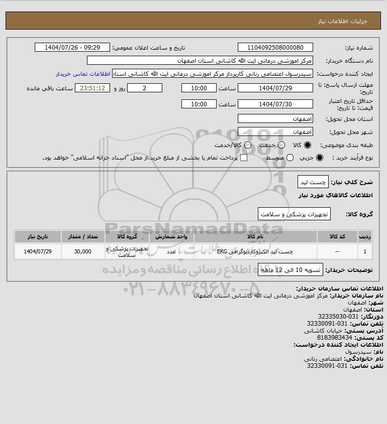 | 1 | -- | چست لید الکتروکاردیوگرافی EKG | عدد | تجهیزات پزشکی و سلامت | 30,000 | 1404/07/29 |