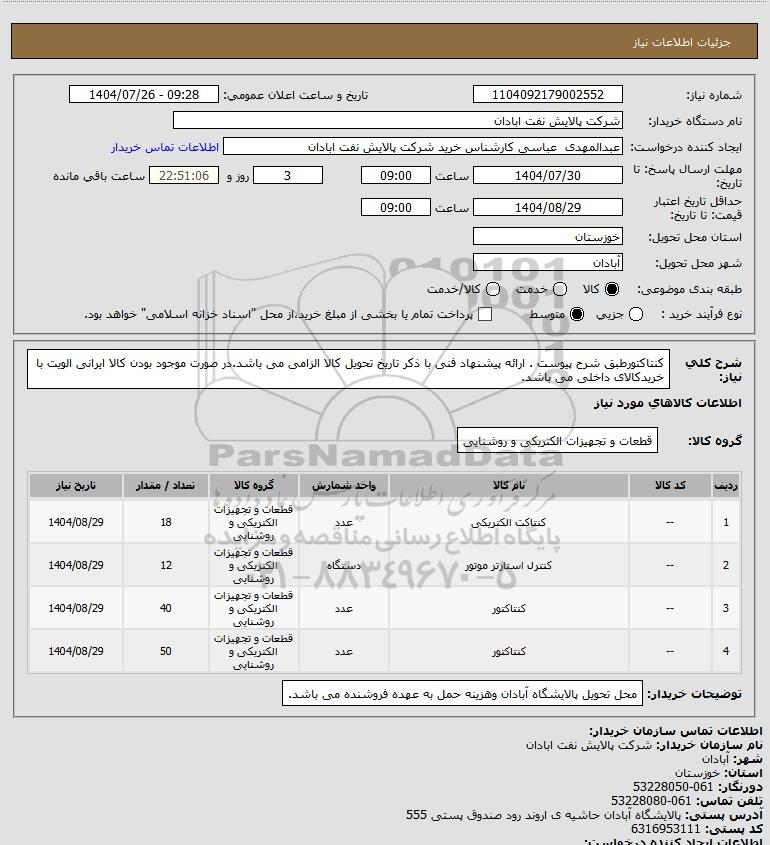 | 4 | -- | کنتاکتور | عدد | قطعات و تجهیزات الکتریکی و روشنایی | 50 | 1404/08/29 |