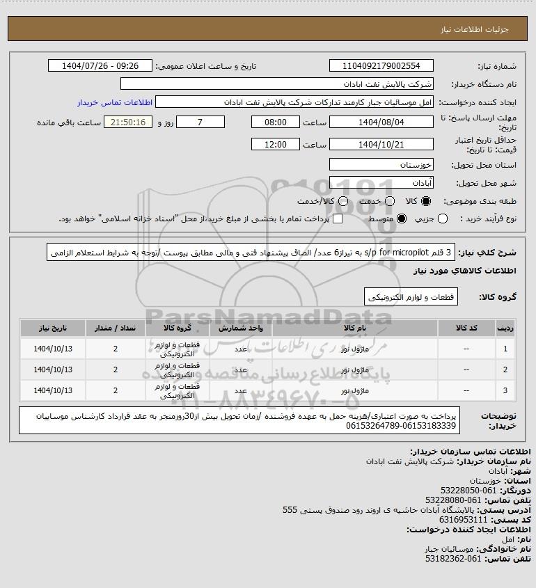 شرح کلی نیاز: 3 قلم s/p for micropilot به تیراز6 عدد/ الصاق پیشنهاد فنی و مالی مطابق پیوست /توجه به شرایط استعلام الزامی