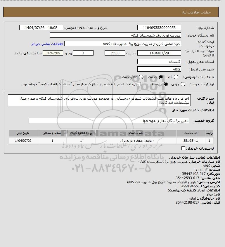 شرح کلی نیاز: اجرای پروژه های نصب انشعابات شهری و روستایی در محدوده مدیریت توزیع نیروی برق شهرستان کلاله درصد و مبلغ پیشنهادی قید گردد.