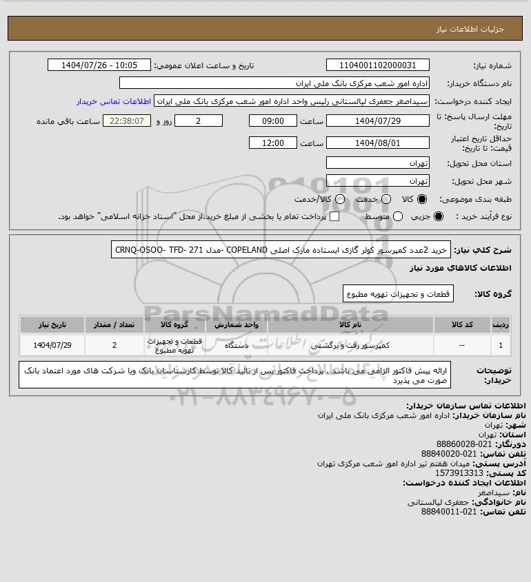 شرح کلی نیاز: خرید 2عدد کمپرسور کولر گازی ایستاده مارک اصلی COPELAND -مدل CRNQ-OSOO- TFD- 271