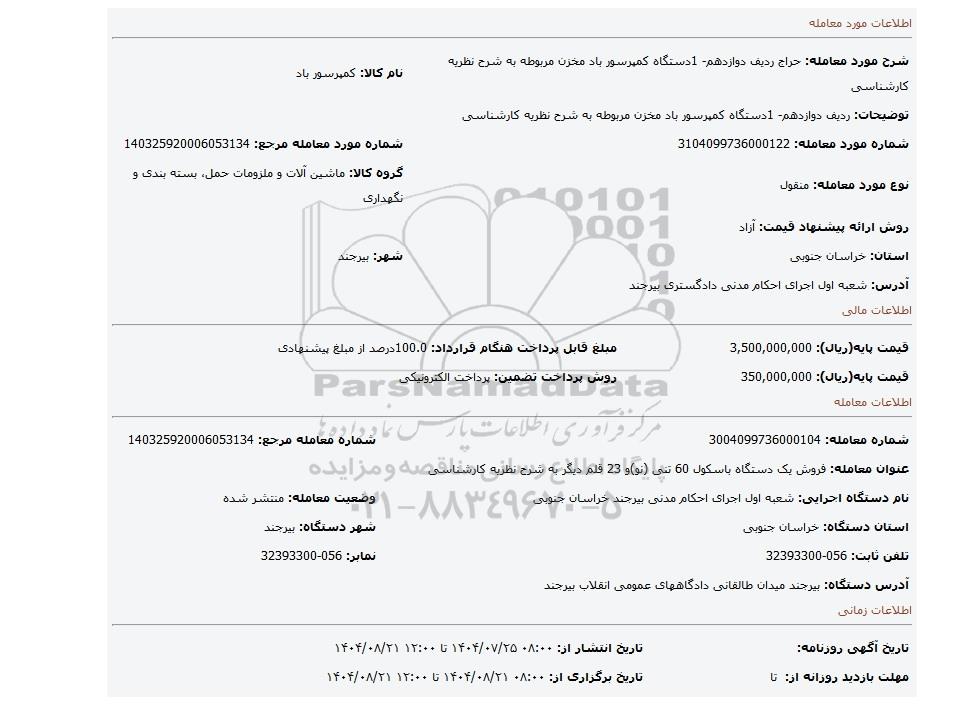 مزایده عمومی مزایده ردیف دوازدهم- 1دستگاه کمپرسور باد مخزن مربوطه به شرح نظریه کارشناسی برگزار میگردد. از کلیه افراد متخصص و شرکتهای واجد شرایط دعوت به عمل میآید تا در این مزایده با کد خبرگزاری پارس نماد : 9712689 شرکت نمایند تاریخ شروع مزایده : 1404/07/25 مهلت شرکت در مزایده: تا پایان روز 1404/08/21 مکان برگزاری اموال واگذاری استانهای خراسان جنوبی و دستهبندیهای مربوط به این حراجی کمپرسور هوا میباشد.