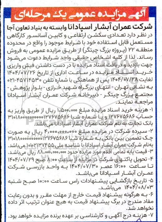 شرکت عمران آبشار اسپادانا وابسته به بنیاد تعاون آجا در نظر دارد تعدادی سکشن ارتفاعی و کابین آسانسور کارگاهی مستعمل قابل استفاده خود با شرایط موجود را واقع در محدوده منطقه 22 (پروژه بزرگ چیتگر) از طریق مزایده عمومی به فروش رساند. لذا از کلیه اشخاص حقیقی واجد شرایط دعوت می شود جهت بازدید و دریافت اسناد مزایده با در دست داشتن فیش واریزی خرید اسناد مزایده در ساعت اداری از تاریخ 1404.07.26 لغایت 1404.07.28 پس از هماهنگی با شماره تلفن 45714530 - 021 به نشانی تهران - انتهای بزرگراه شهید خرازی - بلوار پژوهش -مجتمع بزرگ چیتگر - دبیرخانه شرکت عمران آبشار اسپادانا مراجعه نمایند.