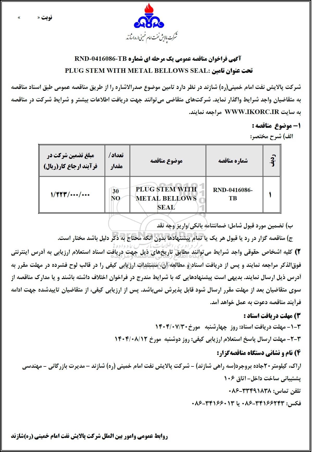 مناقصه عمومی تامین PLUG STEM WITH METAL BELLOWS SEAL, مناقصه عمومی تامین PLUG STEM WITH METAL BELLOWS SEAL
