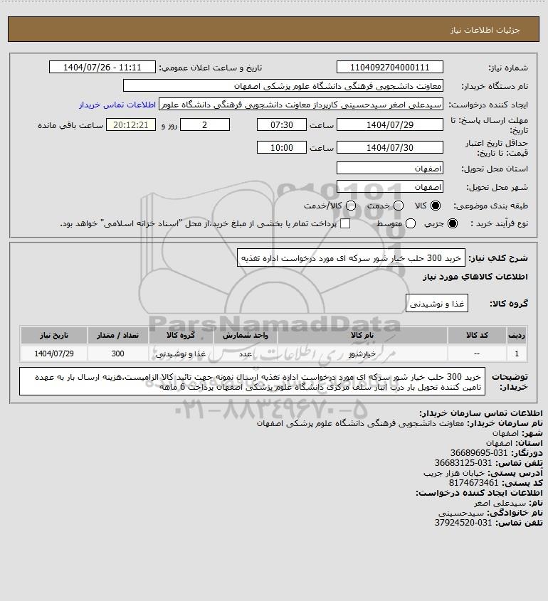 توضیحات خریدار:خرید 300 حلب خیار شور سرکه ای مورد درخواست اداره تغذیه ارسال نمونه جهت تائید کالا الزامیست.هزینه ارسال بار به عهده تامین کننده تحویل بار درب انبار سلف مرکزی دانشگاه علوم پزشکی اصفهان پرداخت 6 ماهه