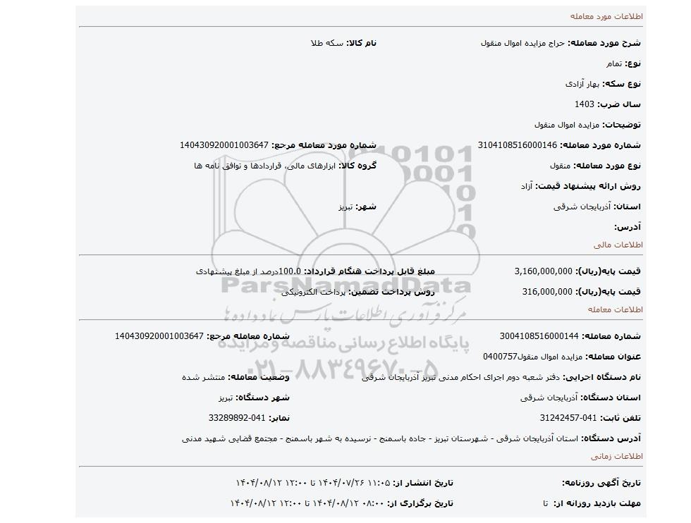 | شرح مورد معامله: حراج مزایده اموال منقول | نام کالا: سکه طلا | |