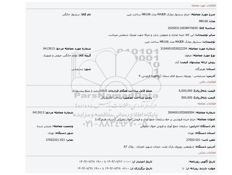 مزایده عمومی مزایده سشوار بمارک MAIER مدل MR106 ساخت چین برگزار میگردد. از کلیه افراد متخصص و شرکتهای واجد شرایط دعوت به عمل میآید تا در این مزایده با کد خبرگزاری پارس نماد : 9713324 شرکت نمایند تاریخ شروع مزایده : 1404/07/26 مهلت شرکت در مزایده: تا پایان روز 1404/07/28 مکان برگزاری اموال واگذاری استانهای هرمزگان و دستهبندیهای مربوط به این حراجی متفرقه میباشد.
