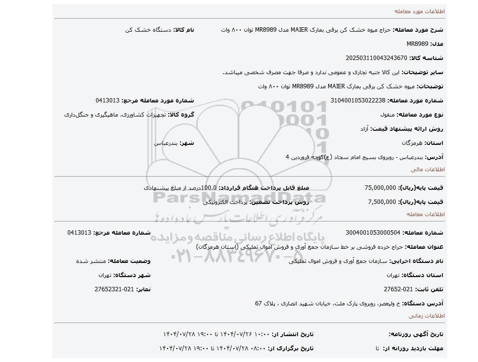 | شماره مورد معامله: 3104001053022238 | شماره مورد معامله مرجع: 0413013 | |