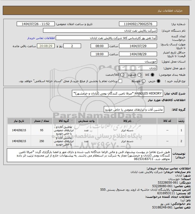 استعلام HANDLES HICKORY *صرفا تامین کنندگان بومی (آبادان و خرمشهر)*, استعلام HANDLES HICKORY *صرفا تامین کنندگان بومی (آبادان و خرمشهر)*