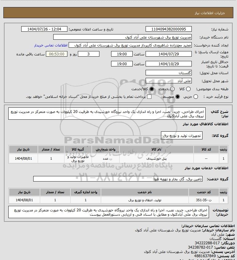 استعلام اجرای طراحی خرید نصب اجرا و راه اندازی یک واحد نیروگاه خورشیدی به ظرفیت 20 کیلووات به صورت متمرکز در مدیریت توزیع نیروی برق علی آبادکتول, استعلام اجرای طراحی، خرید، نصب، اجرا و راه اندازی یک واحد نیروگاه خورشیدی به ظرفیت 20 کیلووات به صورت متمرکز در مدیریت توزیع نیروی برق علی آبادکتول