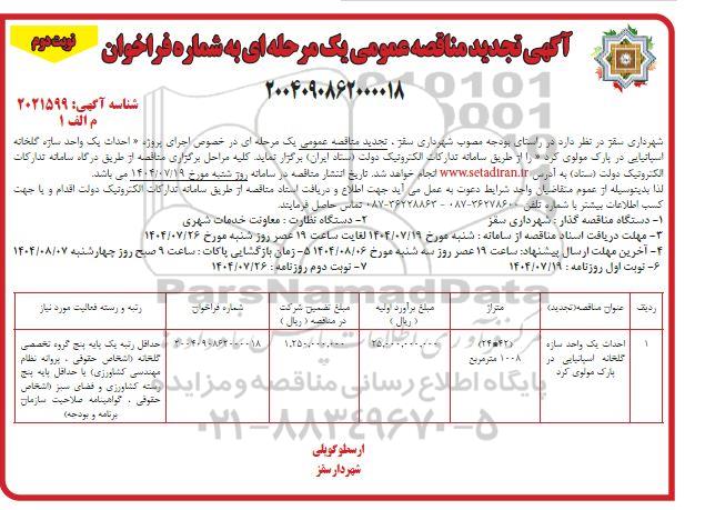 شهرداری سقز در نظر دارد در راستای بودجه مصوب شهرداری سقز، تجدید مناقصه عمومی یک مرحله ای در خصوص اجرای پروژه احداث یک واحد سازه گلخانه اسپانیایی در پارک مولوی کرد را از طریق سامانه تدارکات الکترونیک دولت ستاد ایران برگزار نماید. کلیه مراحل برگزاری مناقصه از طریق درگاه سامانه تدارکات الکترونیک دولت (ستاد) به آدرس ستاد ایران انجام خواهد شد. تاریخ انتشار مناقصه در سامانه روز شنبه مورخ1404.07.19 می باشد.