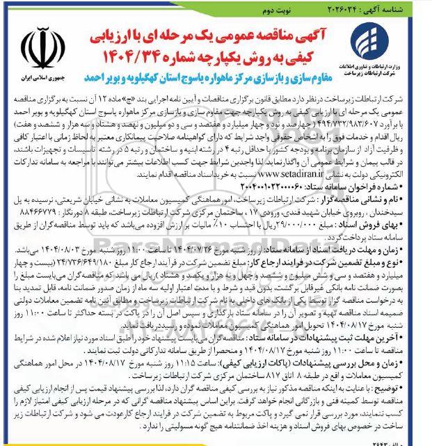 شرکت ارتباطات زیرساخت در نظر دارد مطابق قانون برگزاری مناقصات و آیین نامه اجرایی بند «ج» ماده 12 آن نسبت به برگزاری مناقصه عمومی یک مرحله ای با ارزیابی کیفی به روش یکپارچه جهت مقاوم سازی و بازسازی مرکز ماهواره یاسوج استان کهگیلویه و بویر احمد با برآورد 494.732.983.607 ( چهارصد و نود و چهار میلیارد و هفتصد و سی و دو میلیون و نهصد و هشتاد و سه هزار و ششصد و هفت) ریال اقدام و خدمات فوق را به اشخاص حقوقی واجد شرایط که دارای گواهینامه صلاحیت پیمانکاری معتبر به لحاظ زمانی با اعتبار کافی و ظرفیت آزاد از سازمان برنامه و بودجه کشور با حداقل رتبه 4 در رشته ابنیه و ساختمان و رتبه 5 در رشته تاسیسات و تجهیزات باشند، در قالب پیمان و شرایط عمومی آن واگذار نماید. لذا واجدین شرایط جهت کسب اطلاعات بیشتر میتوانند با مراجعه به سامانه تدارکات الکترونیکی دولت به نشانی ستاد ایران نسبت به خرید اسناد مناقصه اقدام نمایند.