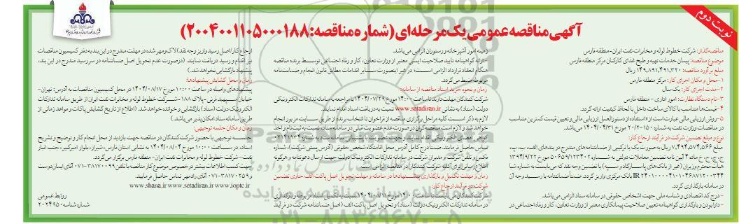 آگهی مناقصه عمومی یک مرحله ای (شماره فراخوان 2004001105000188) نوبت دوم