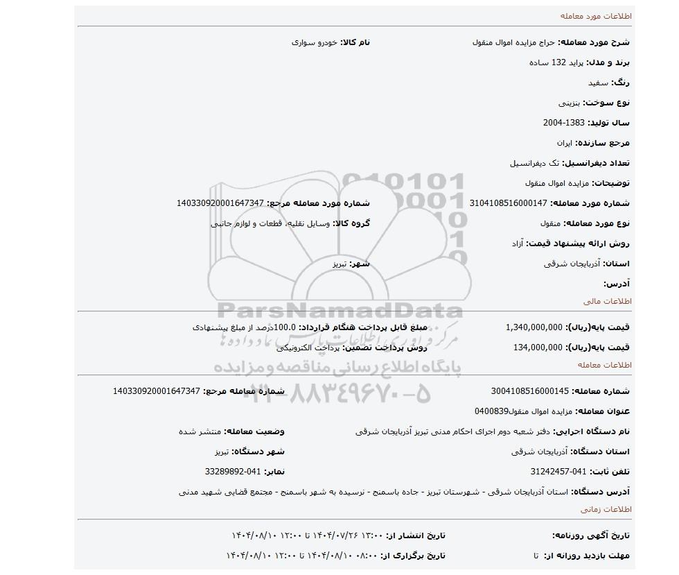 | شرح مورد معامله: حراج مزایده اموال منقول | نام کالا: خودرو سواری | |