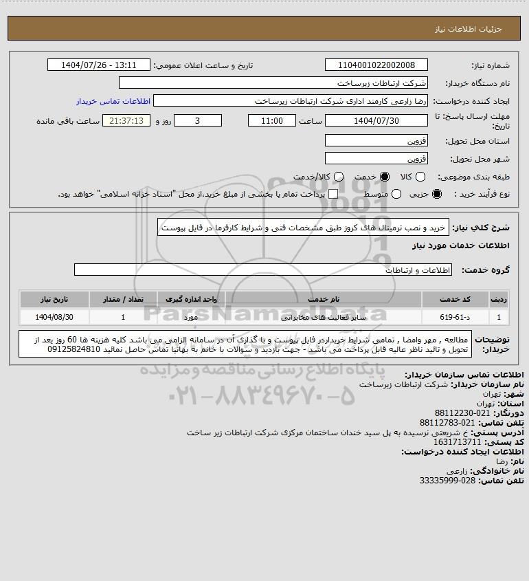 شرح کلی نیاز: خرید و نصب ترمینال های کروز طبق مشخصات فنی و شرایط کارفرما در فایل پیوست