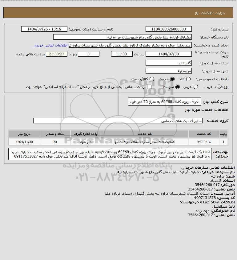 شرح کلی نیاز: اجرای پروژه کانال 60*60 به متراژ 70 متر طول