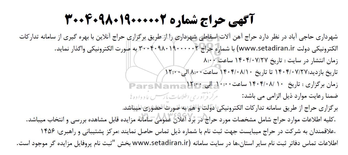 شهرداری حاجی آباد در نظر دارد حراج آهن آلات اسقاطی شهرداری را از طریق برگزاری حراج آنلاین با بهره گیری از سامانه تدارکات الکترونیکی دولت ستاد ایران با شماره حراج 3004098019000002 به صورت الکترونیکی واگذار نماید.