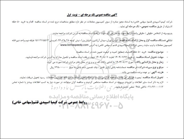 شرکت کیمیا اسپیدی قشم (سهامی خاص) به استناد مجوز صادره از سوی کمیسیون معاملات، در نظر دارد مطابق مشخصات درج شده در اسناد مناقصه اقدام به خرید 50 حلقه لاستیک از طریق مناقصه عمومی - تک مرحله ای نماید.