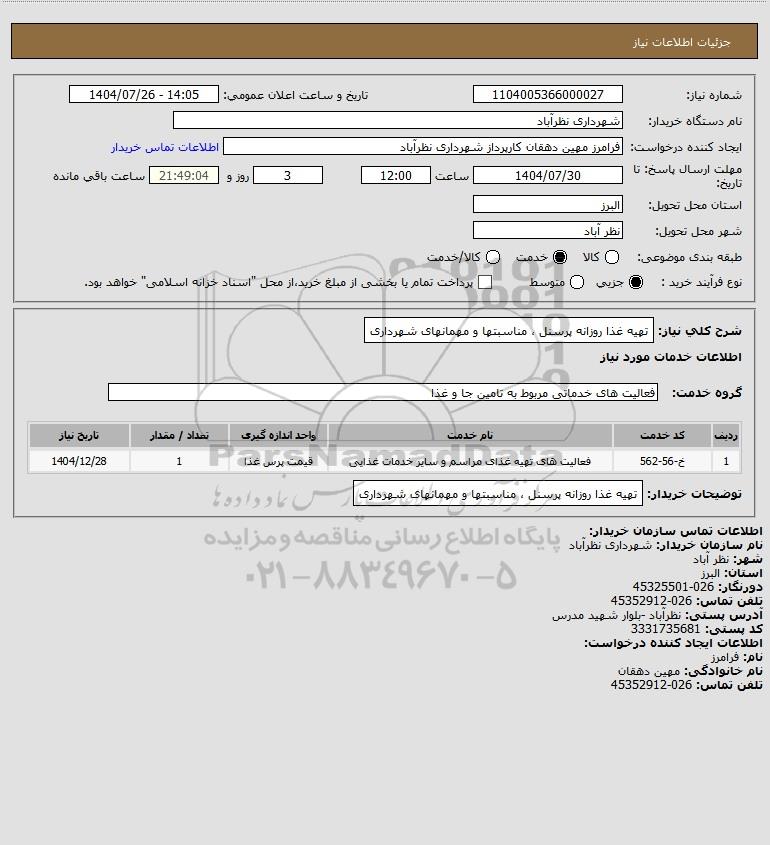 شرح کلی نیاز: تهیه غذا روزانه پرسنل ، مناسبتها و مهمانهای شهرداری