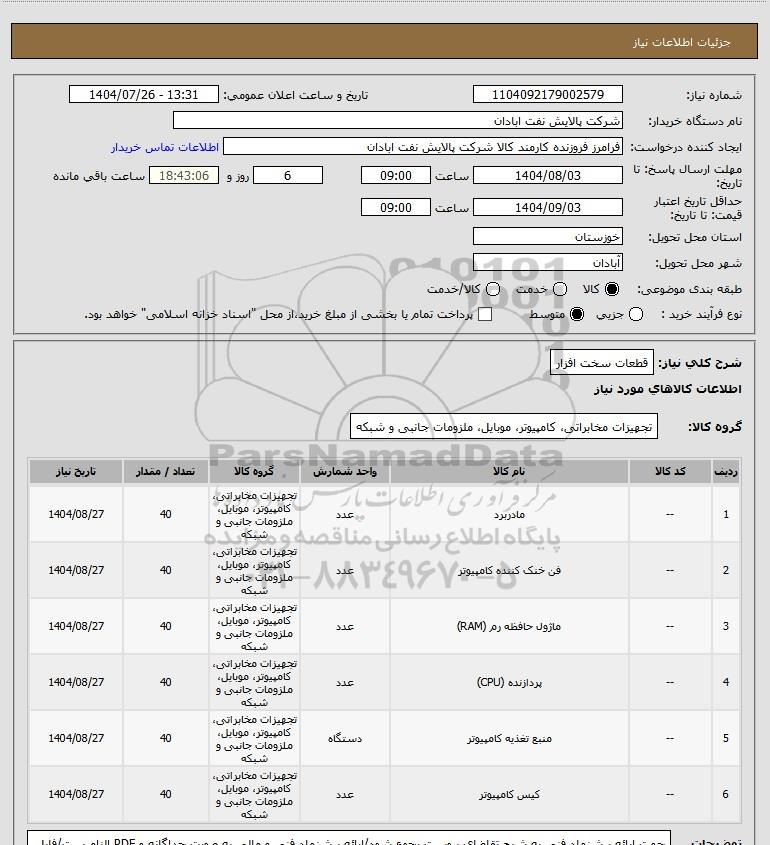 | 6 | -- | کیس کامپیوتر | عدد | تجهیزات مخابراتی، کامپیوتر، موبایل، ملزومات جانبی و شبکه | 40 | 1404/08/27 |