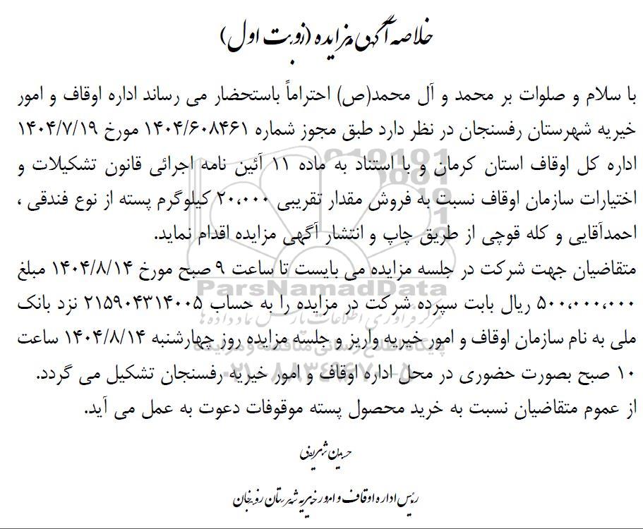 باستحضار می رساند اداره اوقاف و امور خیریه شهرستان رفسنجان در نظر دارد طبق مجوز شماره 1404/608461 مورخ 1404.7.19 اداره کل اوقاف استان کرمان و با استناد به ماده 11 آئین نامه اجرائی قانون تشکیلات و اختیارات سازمان اوقاف نسبت به فروش مقدار تقریبی 20.000 کیلوگرم پسته از نوع فندقی ، احمد آقایی و کله قوچی از طریق چاپ و انتشار آگهی مزایده اقدام نماید.