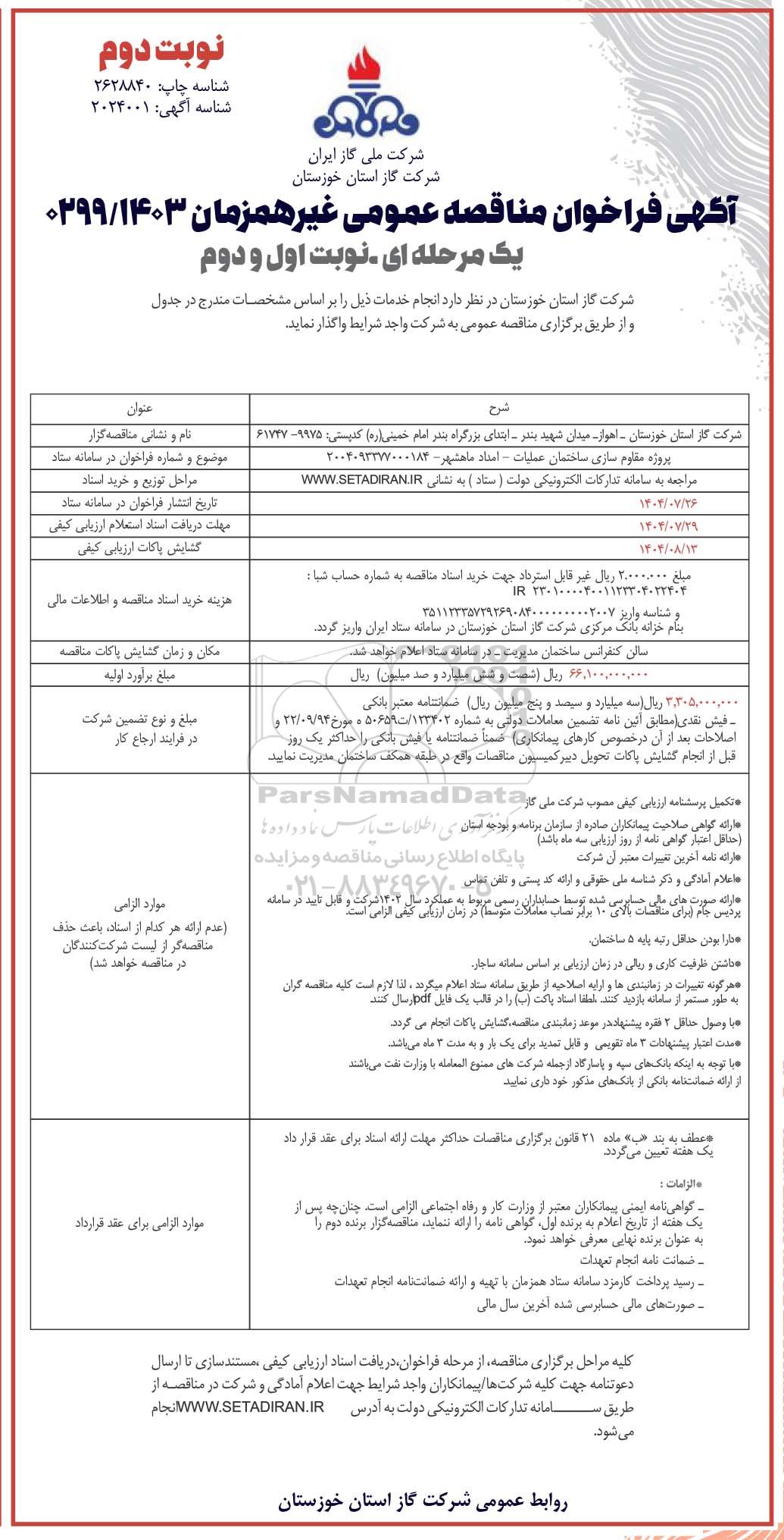شرکت گاز استان خوزستان در نظر دارد انجام خدمات ذیل را بر اساس مشخصات مندرج در جدول و از طریق برگزاری مناقصه عمومی به شرکت واجد شرایط واگذار نماید.