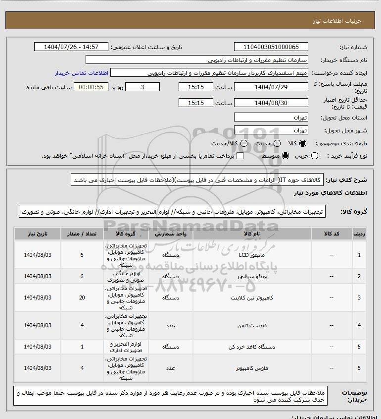 نام دستگاه خریدار:سازمان تنظیم مقررات و ارتباطات رادیویی