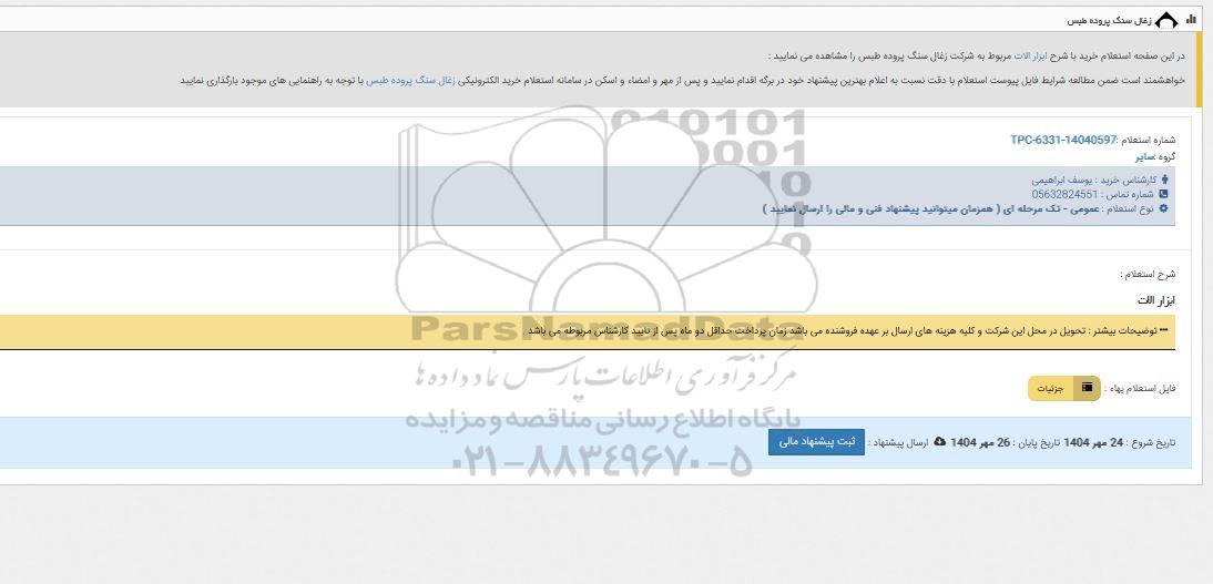 نوع استعلام: عمومی - تک مرحله ای (همزمان می توانید پیشنهاد فنی و مالی را ارسال نمایید)