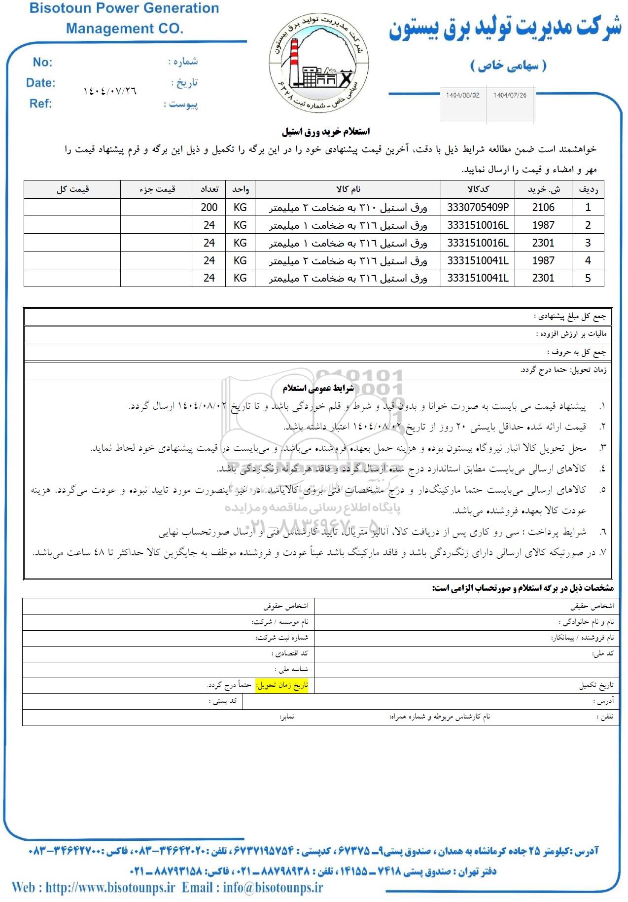 استعلام خرید ورق استیل , استعلام خرید ورق استیل