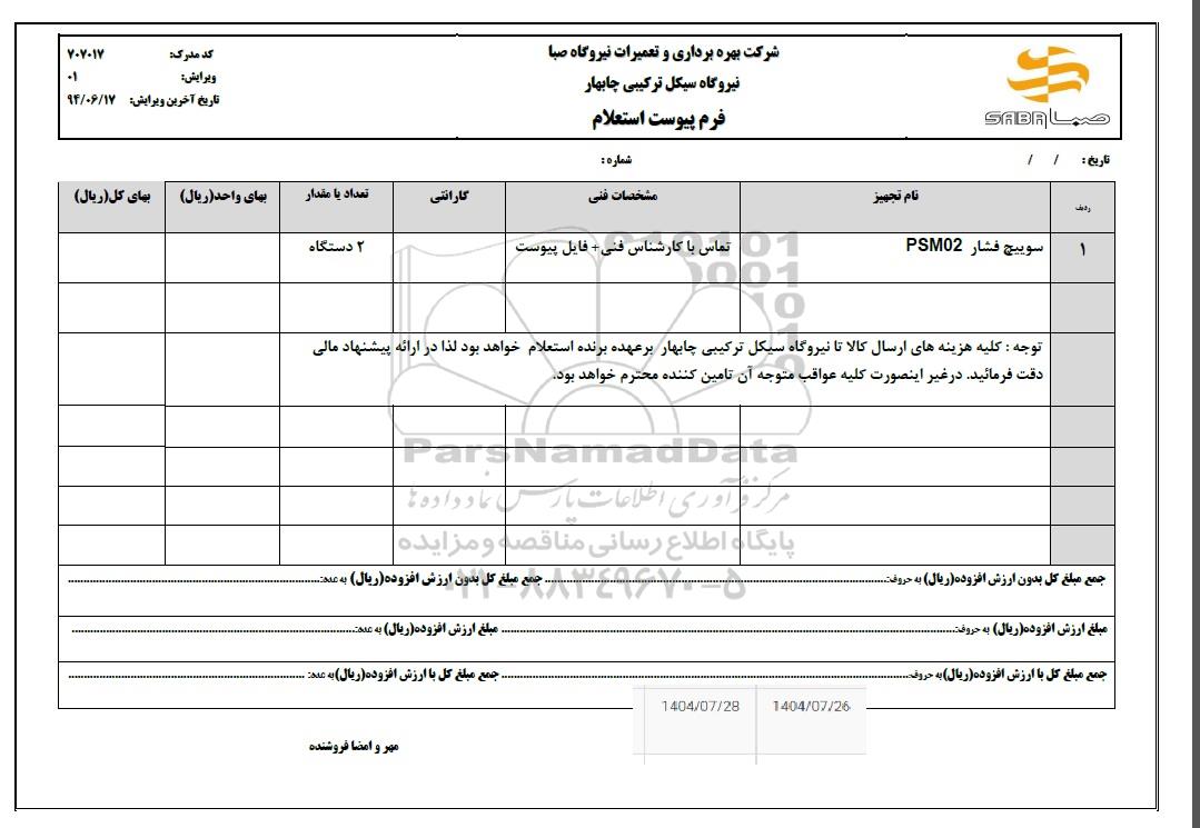 استعلام سوییچ فشار PSM02, استعلام سوییچ فشار PSM02